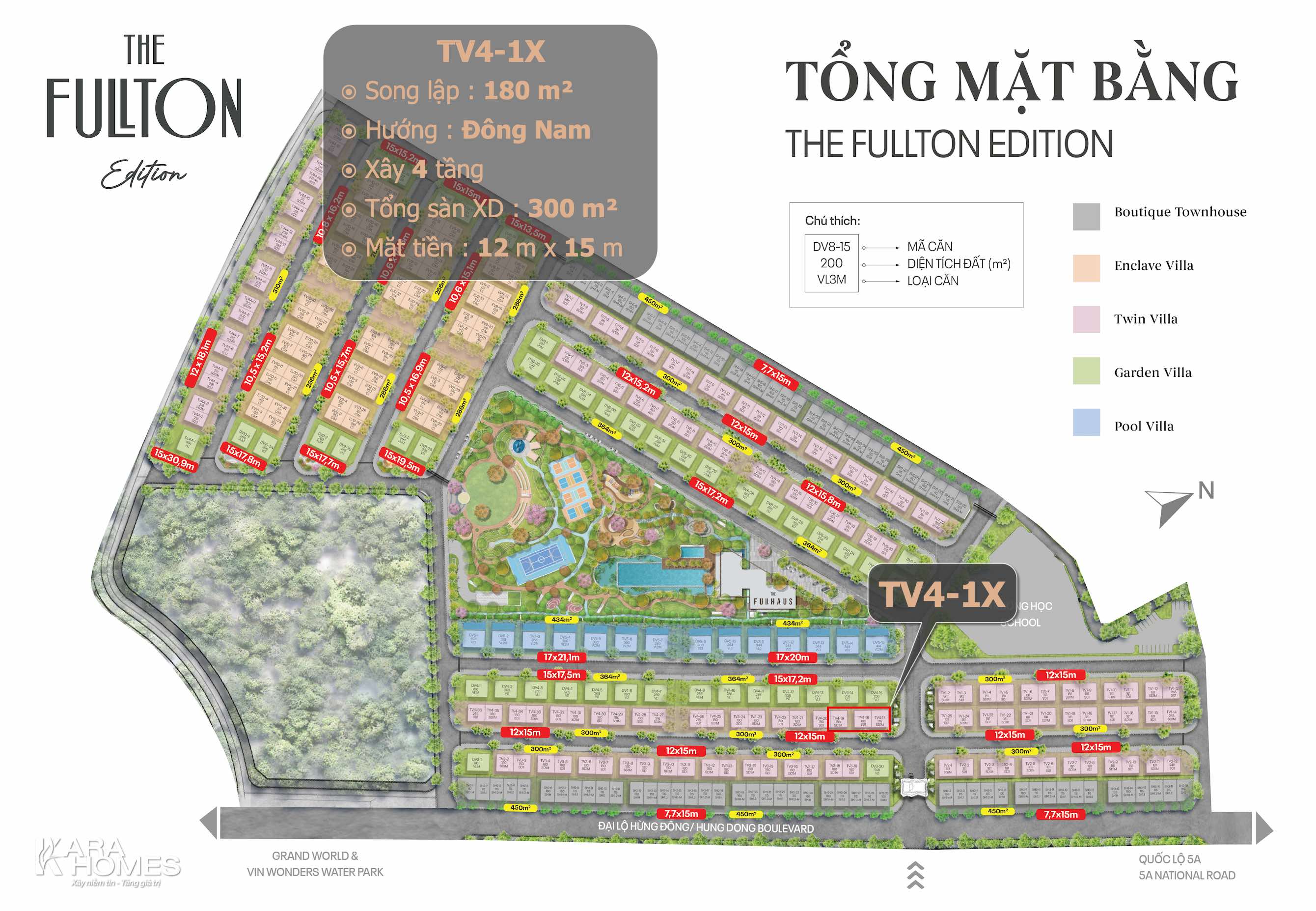 | Giai đoạn 1 : | The Fullton Edition : Quy mô 11,6 hecta – 342 căn ✥ Boutique Townhouse (78 căn) : ~115 - 168m2 ✥ Enclave Villa - Tứ lập (72 căn) : ~151 - 179m2 ✥ Twin Villa - Song lập (132 căn) : ~180 - 250m2 ✥ Garden Villa - Biệt thự vườn (46 căn) : ~200 - 464m2 ✥ Pool Villa - Biệt thự bể bơi (14 căn) : ~344 - 414m2 Bàn giao dự kiến : Q4/2026 |