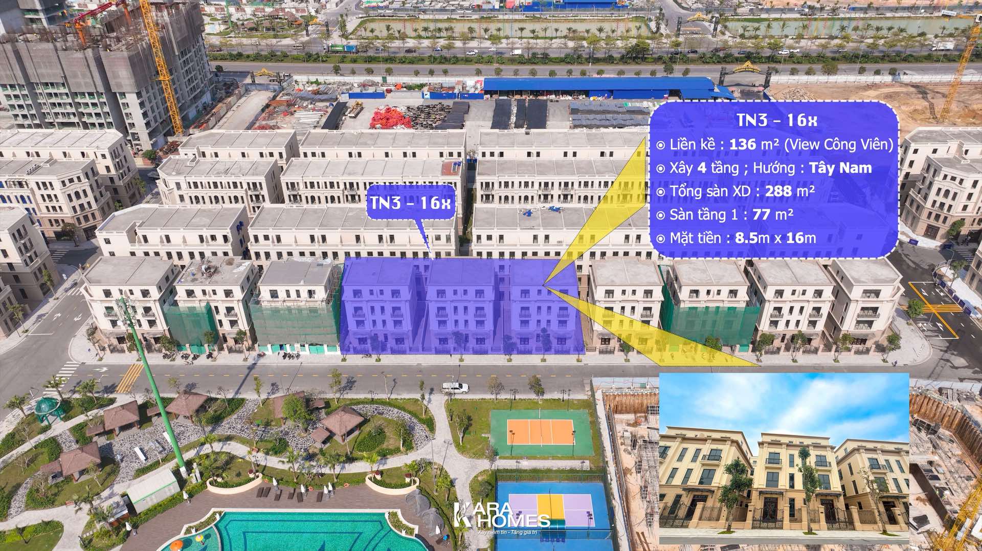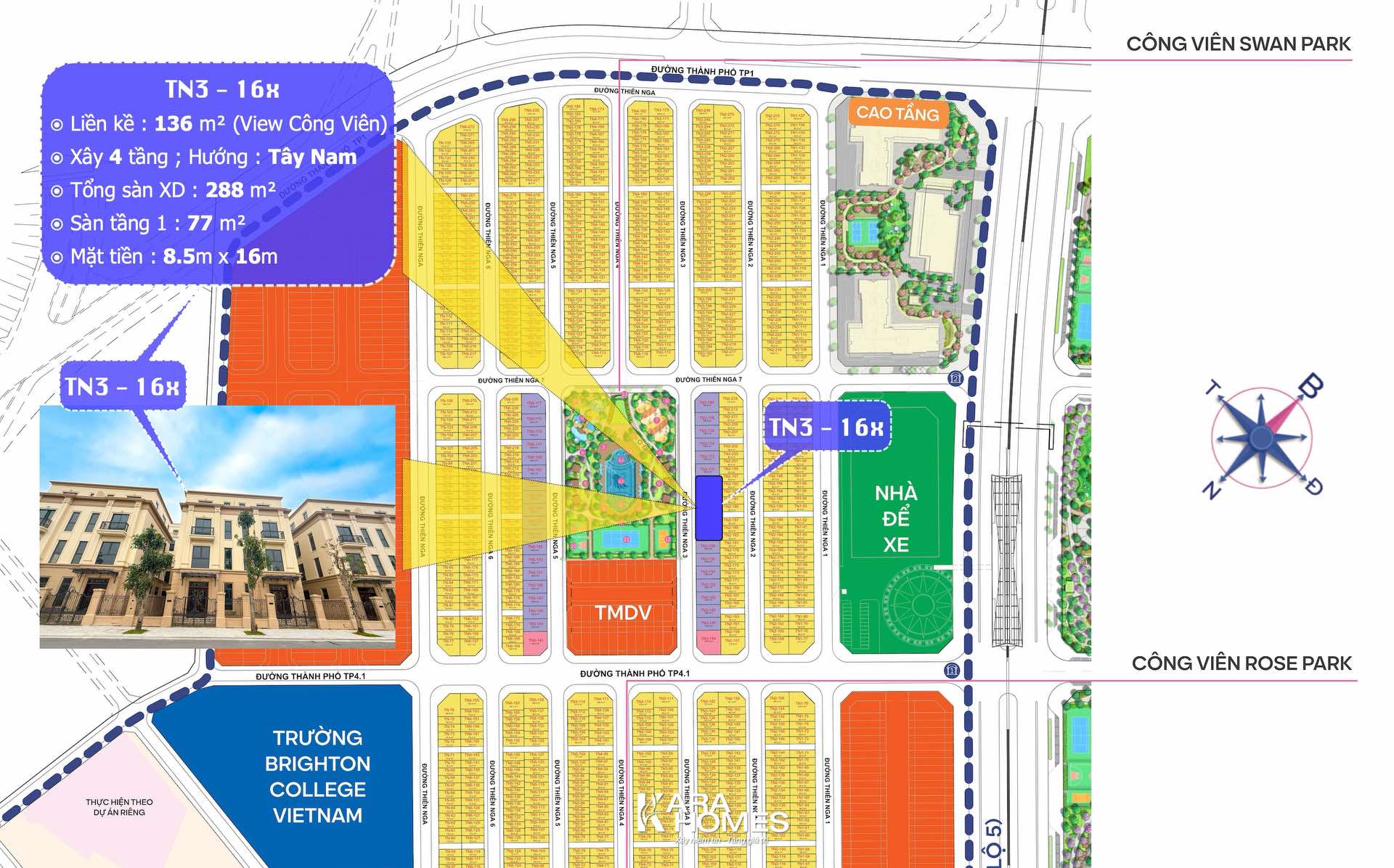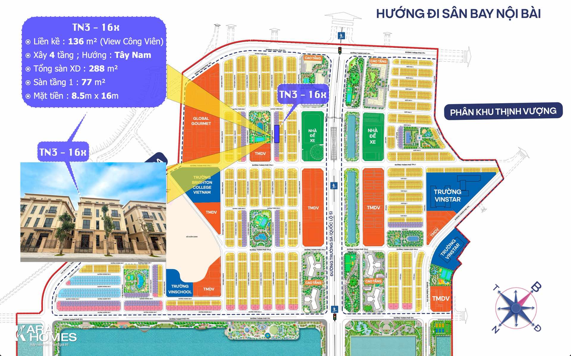 ⦿ Với TN3-16x: đường trước nhà rộng gần công viên → lưu lượng người đi bộ cao -> có thể vừa ở vừa kinh doanh tầng 1 giống shophouse : café, spa, văn phòng nhỏ, showroom...