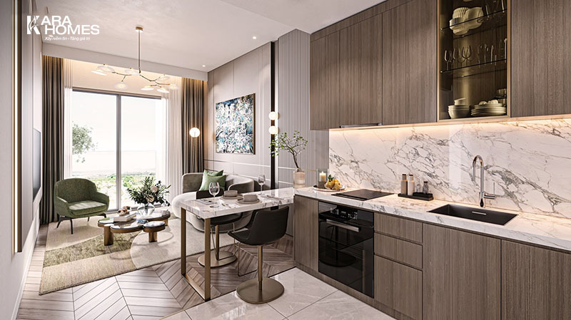 - Khu bếp cao cấp: Trang bị đồng bộ thiết bị từ Bosch, đầy đủ tủ bếp trên dưới, hút mùi, lò nướng, mặt đá Marble tự nhiên và hệ tủ kính sang trọng