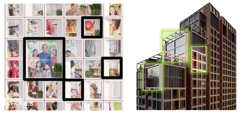 - Kiến trúc mô phỏng hình ảnh các khung cửa sổ gia đình Việt: Chi tiết thiết kế này không chỉ tạo nên bản sắc riêng cho mặt đứng công trình, mà còn hàm chứa thông điệp nhân văn về đời sống đô thị.