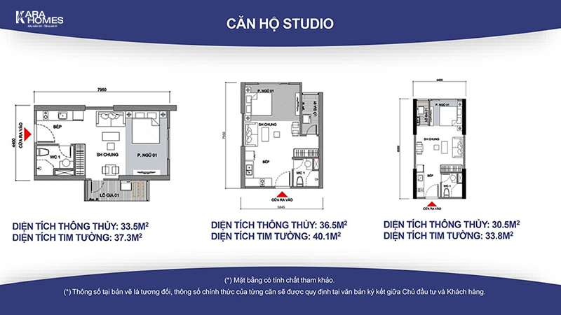 Studio là nhóm căn nhỏ nhất của dải căn hộ dự án, nằm trong khoảng 35–45 m², phù hợp người độc thân, đôi vợ chồng trẻ cần không gian sống gọn gàng hoặc nhà đầu tư mua để cho thuê ngắn - trung hạn nhờ chi phí sở hữu hợp lý và tính thanh khoản cao.