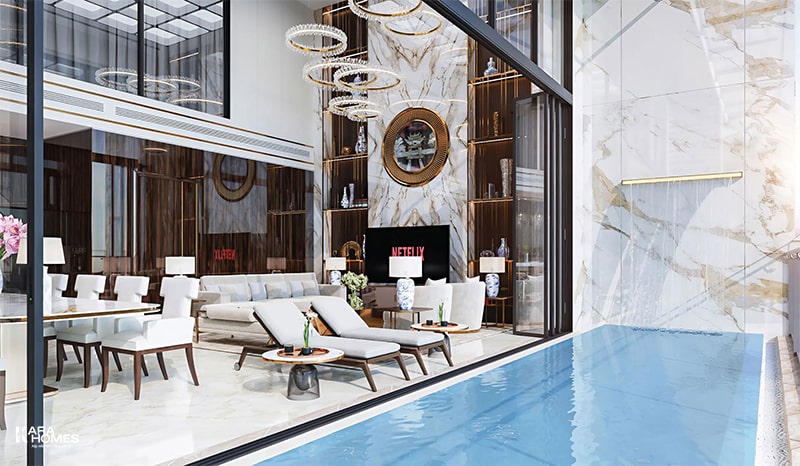 - Bể bơi riêng trong căn hộ – biểu tượng xa xỉ chỉ xuất hiện ở dòng sản phẩm dinh thự trên không