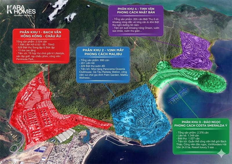 - Khu Đảo Ngọc (Phong cách Ý - Costa Smeralda): Sang trọng, cổ điển, sở hữu bến du thuyền và công viên VinWonders.