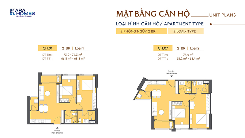 - 2PN: ~ 65 – 74 m², Dòng sản phẩm chủ lực, phù hợp gia đình trẻ, nhu cầu ở thực cao.