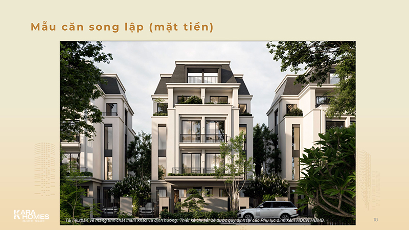 - Triết lý kiến trúc: Đề cao tính đối xứng, tỷ lệ vàng và bố cục chuẩn mực – những yếu tố tạo nên vẻ đẹp vượt thời gian của kiến trúc Neo Classic. Hình khối được xử lý gọn gàng, mang lại cảm giác trật tự và hài hòa cho toàn bộ phân khu.