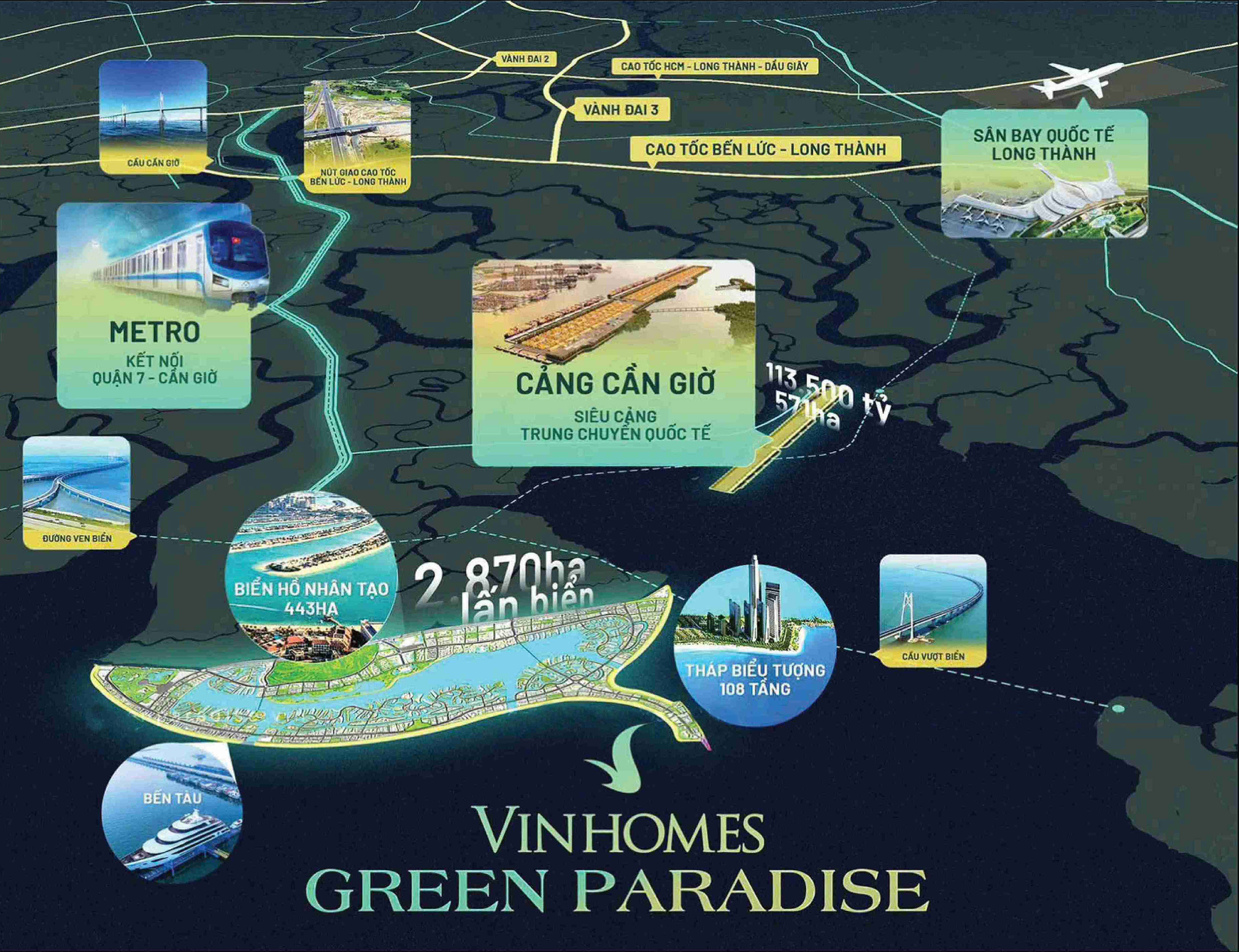 Vinhomes Green Paradise Cần Giờ là siêu đô thị nghỉ dưỡng sinh thái quy mô 2.870 ha, do Tập đoàn Vingroup – thương hiệu dẫn đầu lĩnh vực bất động sản cao cấp tại Việt Nam – phát triển. Tọa lạc tại huyện Cần Giờ, TP.HCM, giữa lòng khu dự trữ sinh quyển rừng ngập mặn thế giới, dự án mang trong mình lợi thế độc bản khi hòa quyện giữa rừng xanh – biển biếc – đô thị hiện đại.