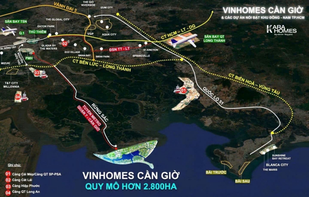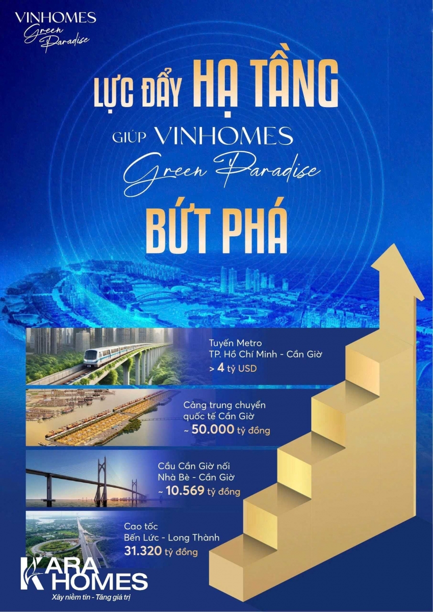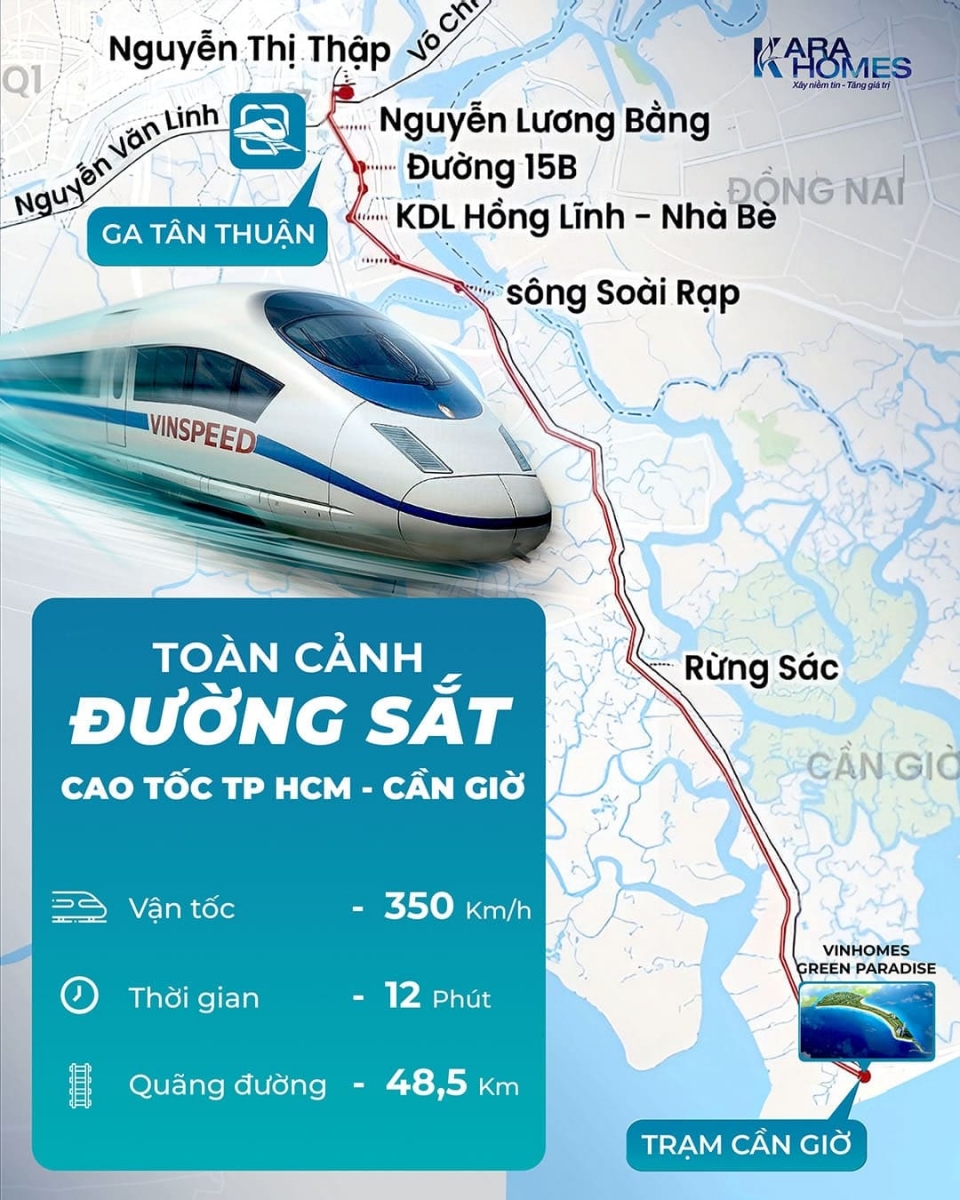 - Tuyến Metro số 4: dài 48,5 km (dự kiến hoàn thành vào năm 2028), giúp rút ngắn chỉ còn 12 phút từ trung tâm TP.HCM đến Vinhomes Green Paradise, đạt tốc độ tối đa 350 km/h, đưa TP.HCM sánh ngang chuẩn hạ tầng quốc tế và mở ra cơ hội phát triển du lịch – kinh tế biển tại Cần Giờ